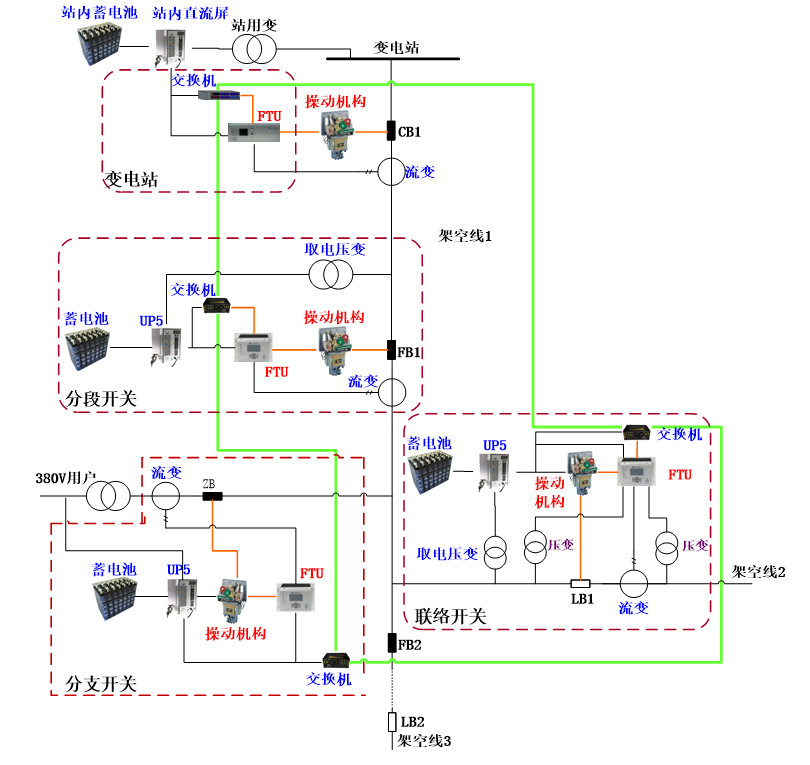 架空线上分段、联络、分支线路都配置断路器;各断路器处配置馈线自动化终端FTU,FTU通过光纤工业以太网互相通信,交换电流和开关状态信息;每个FTU控制一台开关设备,联络开关两端需安装备自投检测电压的压变。如图2所示: