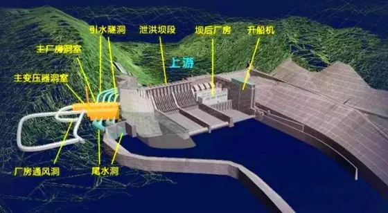 我国的四川省宜宾县金沙江下游建设的向家坝水电站采用实体重力坝,最大坝高161米,坝顶长937.5米。水电站除了在靠左岸建设坝后厂房外,在右岸山体内开挖了地下厂房。地下厂房由主厂房洞室与主变压器洞室组成,4条引水隧洞从上游岸边连通厂房4台水轮机,4条尾水隧洞并为2条后通往下游江边,除此还有进厂交通洞、通风洞、排水洞、出线洞、母线洞、安全兼施工洞等。