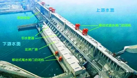 世界上最大的水电站我国的三峡水电站就是坝后式水电站,采用混凝土重力坝。图5是从下游远方眺望三峡水电站的照片,在照片中标出了主要坝段的分布:大坝中间部分是泄洪坝段,两侧是发电厂房坝段,再两侧是非溢流坝段。