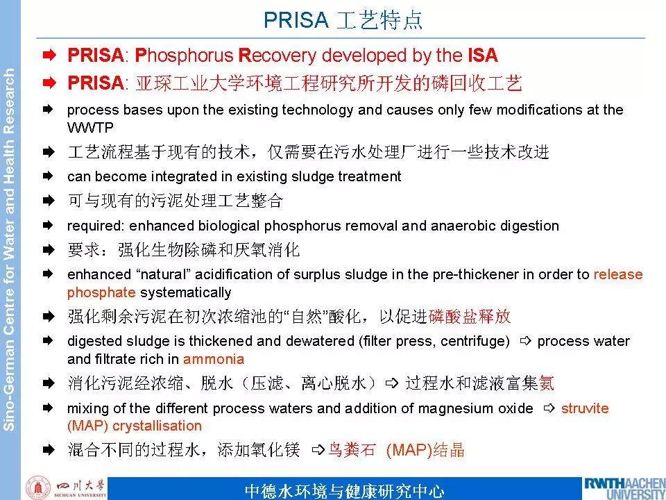 PRISA工艺是从污泥处理过程中产生的工艺水中回收磷(一次浓缩池上清液、厌氧消化池上清液、二次浓缩池上清液)。这三种工艺水中含磷的形态不一样。经过一定的化学处理之后,回收到是大家都非常熟悉的MAP。该回收工艺基于现有的污水处理工艺,仅需要在污水处理厂进行一些技术改进,与现有的污泥处理工艺整合。该回收工艺对污水处理工艺要求,必须采用强化生物除磷工艺,否则污泥处理过程的工艺水中的磷的含量就比较低,就不太适合PRISA回收工艺。磷回收率要大于50%,满足德国新"污泥条例"对于磷回收率的要求。