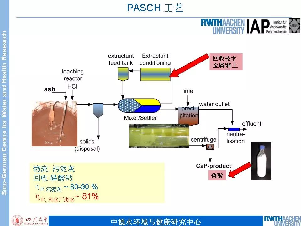 PASCH工艺的特点:PASCH工艺是从污泥焚烧的灰分中回收磷。该工艺磷回收率要大于90%;ISA研究所以及FraunhoferIME研究所的研究结果表明,污泥焚烧过程中有机污染物已经破坏,回收产品的无机杂质含量低,该产品具有良好的植物可利用性;IFEU研究所的研究结果,与其他回收工艺相比(例如协同焚烧、污泥直接农业利用等),PASCH工艺的生态评估具有明显优势。示范项目运行结果表明,PASCH工艺具有较低的成本。