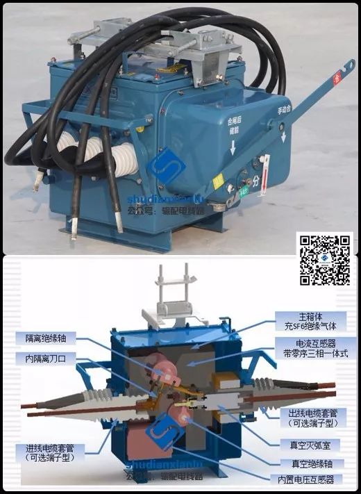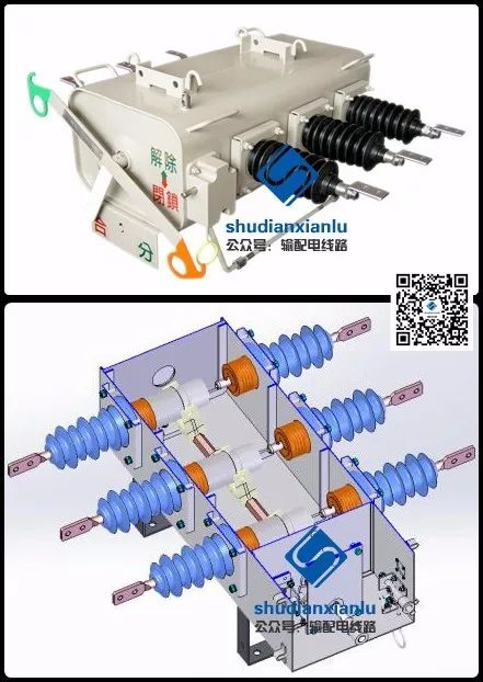 另外采用用柱上SF6负荷开关液不少。SF6负荷开关采用SF6灭弧,SF6绝缘,三相共箱式,电流互感器可内置,电缆或端子出线,外侧可选配隔离装置,吊式或坐式安装。如下图所示: