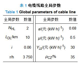 广州城区某变电站拟新建一条长约10 km的10 kV双回路电缆线路出线,排管敷设。根据线路设计容量和其他各方面要求,暂定铜芯电缆8.7/15 kV YJV22 3×300 mm2和铝芯电缆8.7/15 kV YJLV22 3×500 mm22种方案,现运用LCC方法进行2种方案间的选择。参考已有统计数据和资料,并根据该电缆线路拟运行负荷、重要程度和当前市场情况,取全局参数如表1所示,2种电缆具体选型参数如表2所示。