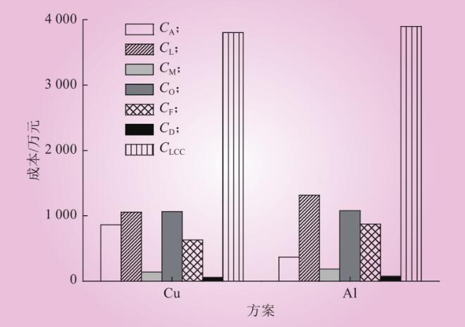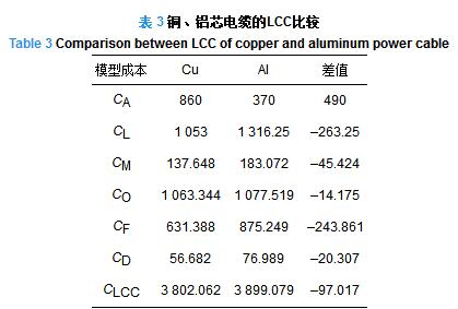 (2)案例中铝芯电缆虽然购置成本更低,但敷设成本和运行维护成本、故障损失成本等后期运行成本均处于劣势,使得总LCC更大,故铜或铝芯电缆的选择不应只看初始投资。