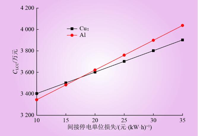 (3)在案例中选取一些因素进行灵敏度分析,发现间接停电单位损失和折现率对铜、铝芯电缆LCC的影响较大,其中较低的间接停电单位电量损失和更高折现率会使铝芯电缆更有优势。