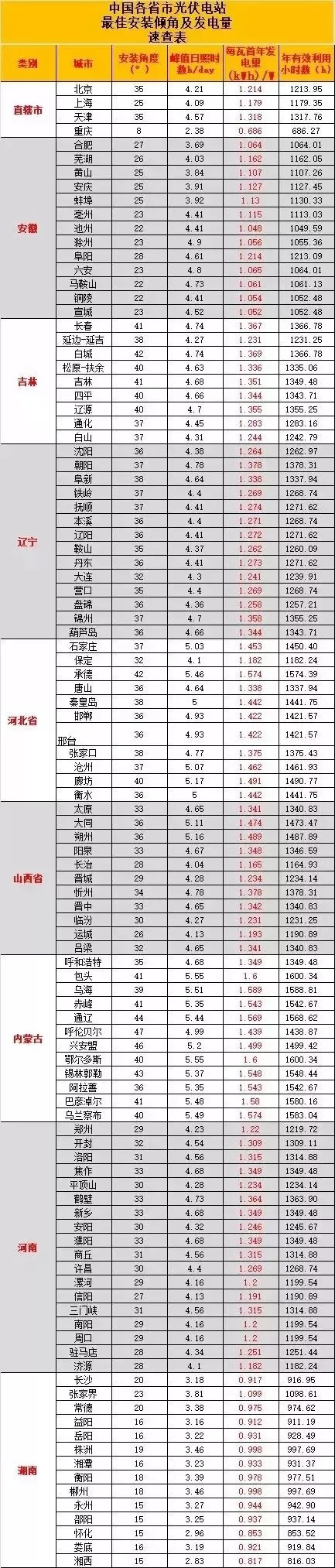 光伏电站设计安装时,电板的安装倾角对电站发电量有着直接的影响。不同纬度地区的最佳安装倾角是有区别的,小编为大家整理了全国各省市光伏电站的最佳安装倾角和发电量表,图片较长,欢迎收藏。