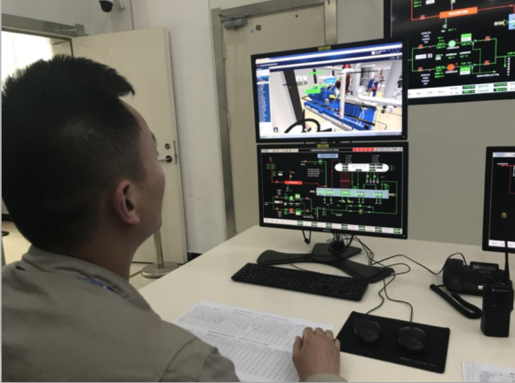 “第一个模块是基于三维可视化的运行及培训系统,以虚拟电厂为例。我们的虚拟电厂以江苏省电力设计院提供的二维图纸以及部分管道的三维模型为基础,通过对主、辅机设备进行三维扫描,形成高精度、等比例的三维建模,与实际厂区布置和设备高度吻合,真正实现了一个全方位的智慧电厂。”大唐泰州热电公司党委书记魏治俊向记者介绍。